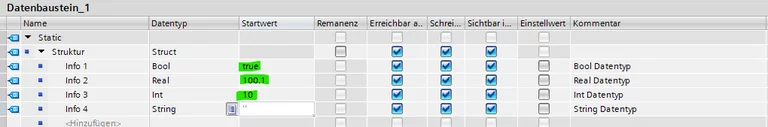 Als erstes legen wir einen Datenbaustein an. Danach fügen wir einfach unsere Variablen und den Datentyp ein. Am besten ist es auch ein Kommentar zu vergeben, damit man später genau sehen kann wozu die Variable da ist.