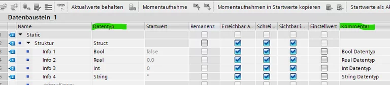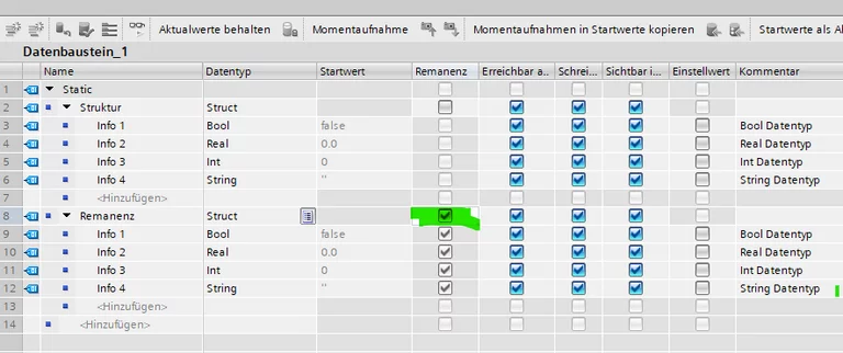 Jetzt haben wir natürlich noch mehr Möglichkeiten, wie zum Bespiel Remanent zu markieren. Aber was ist das eigentlich ? Remanent bedeutet das die Daten die so markiert wurden, nach dem Ausschalten der Steuerung gespeichert werden und beim wieder Zuschalten nicht verloren sind. Dies ist unter anderem wichtig, wenn wir produzierte Elemente zählen, damit bei Stromausfall die bis dahin Produzierten Stückzahl nicht verloren geht.